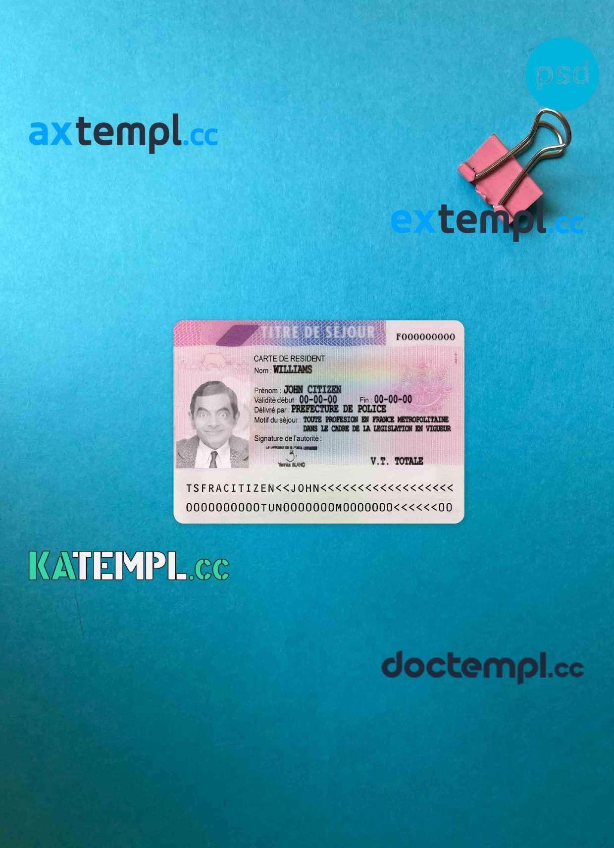 Our French residence permit template offers two options in one package: editable PSD files for both photo and scan looks.