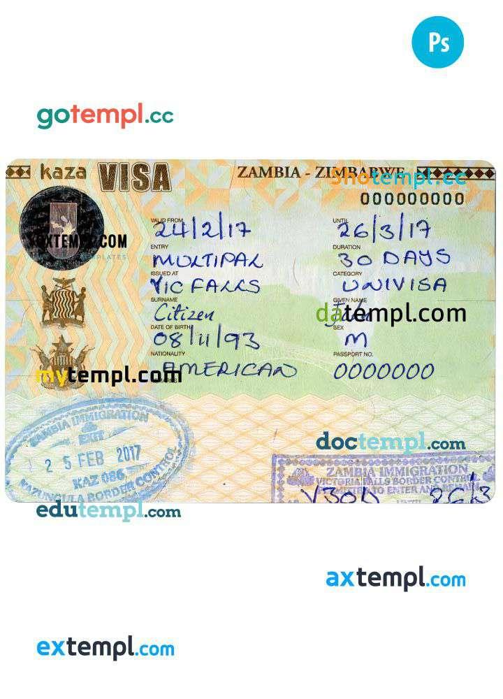 Completely scalable and editable Zambiann and Zimbabweanan travel visa example (for entering both countries).