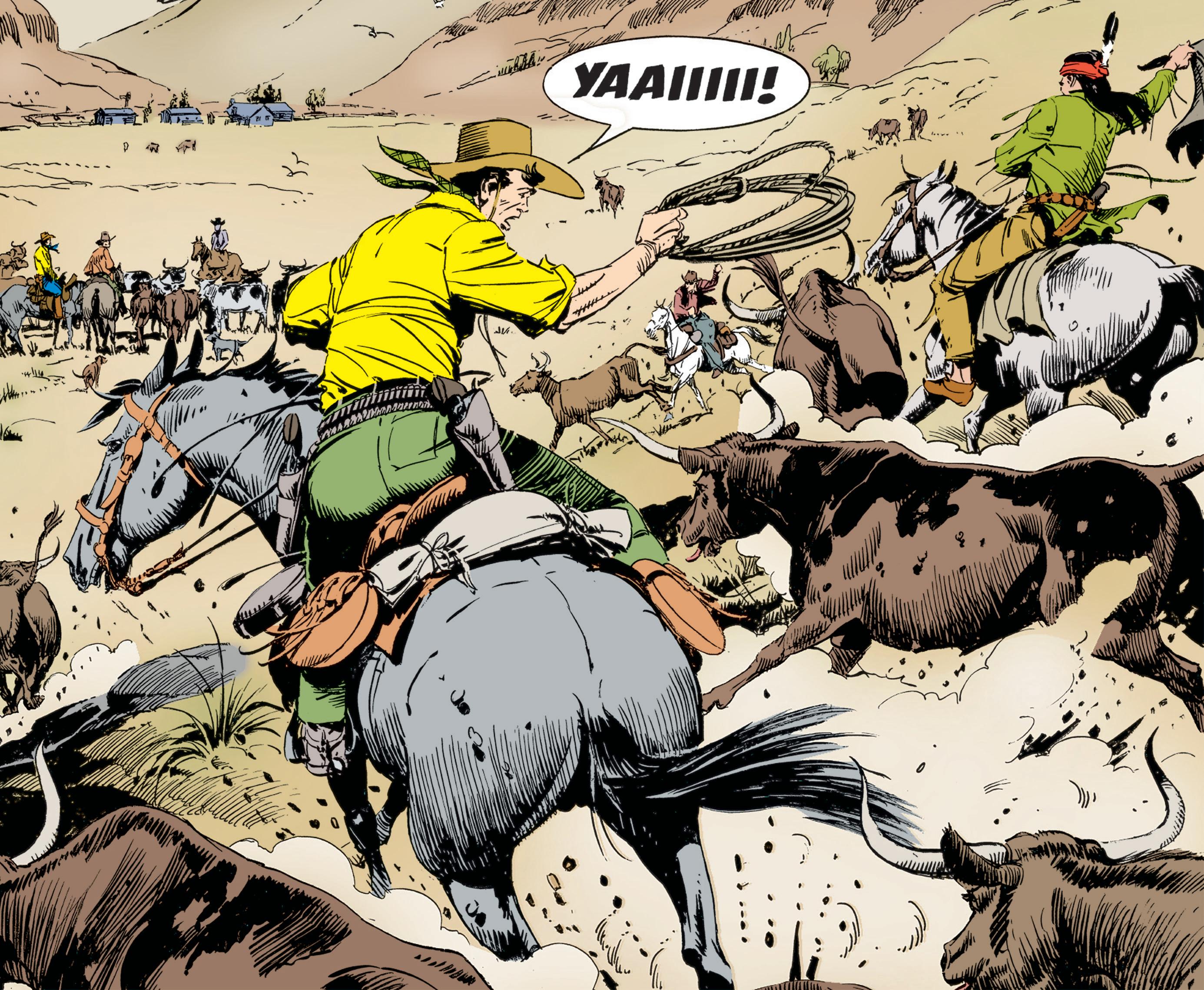 Tra gli svariati compiti di un redattore della nostra Casa editrice, quello della revisione delle bozze è senza dubbio uno dei più importanti… E, proprio poco prima di iniziare a scrivere il testo che state leggendo, ho finito di leggere per la prima volta La cavalcata del destino, preparandolo per la stampa, e sono rimasto rapito dall’avvincente storia magistralmente illustrata da Claudio Villa. Si tratta senza dubbio di un instant classic e capisco bene il motivo per cui è stato deciso di pubblicarne subito la versione cartonata in grande formato. A distanza di poco più di tre anni dall’uscita del Texone/capolavoro L’inesorabile (e da quasi ventuno dall’uscita della sua ultima storia sulla serie regolare), il copertinista di Tex regala un’altra prova sontuosa sulle pagine di un fumetto! Certo i rutilanti colori di Matteo Vattani, utili come da tradizione bonelliana a festeggiare l’albo speciale da edicola per i settantacinque anni, rendono senza dubbio merito all’opera di Villa, ma non potevamo farci e farvi mancare tutta la potenza delle luci e delle ombre racchiuse nel bianco e nero del Maestro di Lomazzo. Chiari e scuri che fanno anche parte dei personaggi della storia memorabile sceneggiata per lui dal curatore delle collane texiane Mauro Boselli. Partendo da un rievocativo soggetto di Graziano Frediani, Boselli ha intessuto una trama al fulmicotone che avvince i lettori e li costringe a rivivere, attraverso lo sguardo del protagonista, il momento più drammatico della vita di Tex: la morte della sua amata Lilyth. Proprio dagli avvenimenti narrati nel magnum opus di G.L. Bonelli e Galep, Il giuramento (pubblicato lo scorso anno in un altro volume di pregio della nostra offerta libraria), parte questa nuova imperdibile avventura di Aquila della Notte! Dunque chi lo ha già letto a colori può gustarsi la sorprendente versione B/N, chi invece ha perso l’albo in edicola non può non accaparrarsi e divorarsi uno dei libri che sicuramente resteranno nella memoria di tutti i lettori!