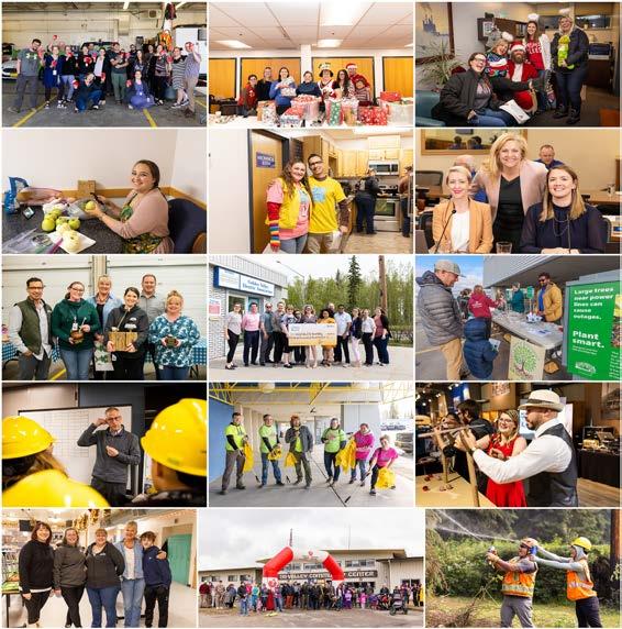 1. The 2nd annual GVEA Office Olympics featured a flip-cup tournament in 2022. | 2. Thank you to every employee who made Adopt-A-Family a success last year! | 3. Santa Joe Waggoner and his holiday cheer squad. | 4. Bri Kurzenberger, being as wholesome as can be, making apple pie on her lunch break. | 5. Bobbie Perkins and Norm Alden were the celebrity judges of the Halloween Cook-off. | 6. The PR team at 2022 Annual Meeting | 7. Chili cook-off champions! | 8. Golden Valley employees raised $48,842.56 for United Way in 2022! | 9. 31st Annual Tree Giveaway. | 10. John Kelly leading a tour of North Pole power plants for a fourth grade class. | 11. Coolest cleanup crews around - 93 employees in Fairbanks, Healy and North Pole participated in clean-up week. | 12. Oz Bolles and Kareen Achman competing in a game during Fairbanks’ Holiday Party. | 13. GVEA volunteers did so much great work in our Interior communities in 2022! | 14. Golden Valley employees and Healy community members came together for the 2nd annual Healy Heart Walk 15. | Art Hughes and engineering intern, Julia Murph on a right-ofway ride along.