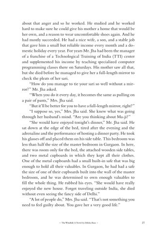 about that anger and so he worked. He studied and he worked hard to make sure he could give his mother a home that would be her own, and a reason to wear uncomfortable shoes again. And he had mostly succeeded. He had a nice wife, a son, and a stable job that gave him a small but reliable income every month and a domestic holiday every year. For years Mr. Jha had been the manager of a franchise of a Technological Training of India (TTI) center and supplemented his income by teaching specialized computer programming classes there on Saturdays. His mother saw all that, but she died before he managed to give her a full-length mirror to check the pleats of her sari. “How do you manage to tie your sari so well without a mirror?” Mr. Jha asked. “When you do it every day, it becomes the same as pulling on a pair of pants,” Mrs. Jha said. “But it’ll be better for you to have a full-length mirror, right?” “I suppose so, yes,” Mrs. Jha said. She knew what was going through her husband’s mind. “Are you thinking about Ma-ji?” “She would have enjoyed tonight’s dinner,” Mr. Jha said. He sat down at the edge of the bed, tired after the evening and the adrenaline and the performance of hosting a dinner party. He took his glasses off and placed them on his side table. This bedroom was less than half the size of the master bedroom in Gurgaon. In here, there was room only for the bed, the attached wooden side tables, and two metal cupboards in which they kept all their clothes. One of the metal cupboards had a small built-in safe that was big enough to hold all their valuables. In Gurgaon, he had had a safe the size of one of their cupboards built into the wall of the master bedroom, and he was determined to own enough valuables to fill the whole thing. He rubbed his eyes. “She would have really enjoyed the new house. Forget traveling outside India, she died without even seeing the fancy side of Delhi.” “A lot of people do,” Mrs. Jha said. “That’s not something you need to feel guilty about. You gave her a very good life.”