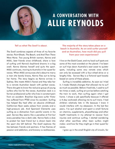 ALLIE REYNOLDS Tell us what The Swell is about. The Swell combines aspects of three of my favorite stories: Point Break, The Beach, and And Then There Were None. Two young British women, Kenna and Mikki, best friends since childhood, share a love of surfing until Kenna’s boyfriend drowns in a big swell. Kenna blames herself and quits the sport. Mikki continues, moving to Australia in her quest for waves. When Mikki announces she’s about to marry a man she barely knows, Kenna flies out to bring her home. The story begins as Kenna arrives in Sydney. She meets Mikki’s fiancé and they take her to a remote Australian beach with perfect waves. There she gets to know the reclusive group of young surfers who live for the waves. Australian Jack is a former professional surfer who lives in constant pain from an accident. Brazilian big-wave surfer Victor has suffered from PTSD since his accident. Surfing has helped Sky heal after an abusive childhood. Californian Ryan seeks solace from anxiety and a high-pressure job. And Spaniard Clemente uses surfing as a distraction from painful events in his past. Sorrow Bay seems like a paradise at first but every paradise has a dark side. Kenna feels a duty to protect her best friend but is drawn back into the sport she left behind. The Swell explores the ties between friends and partners. It has themes of passion and addiction, and bravery vs recklessness.
