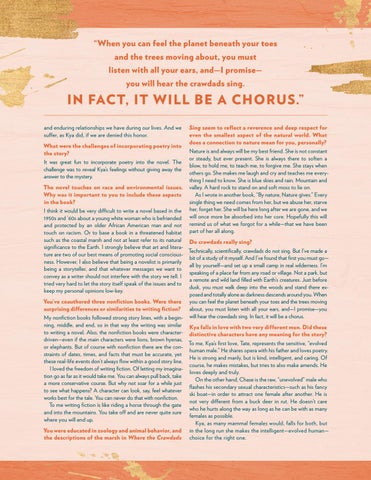 IN FACT, IT WILL BE A CHORUS.” and enduring relationships we have during our lives. And we suffer, as Kya did, if we are denied this honor. What were the challenges of incorporating poetry into the story? It was great fun to incorporate poetry into the novel. The challenge was to reveal Kya’s feelings without giving away the answer to the mystery. The novel touches on race and environmental issues. Why was it important to you to include these aspects in the book?