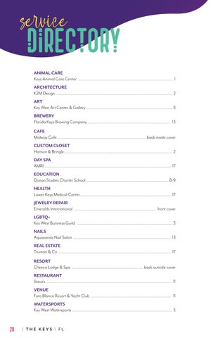 20 | THE KEYS | FL ANIMAL CARE Keys Animal Care Center 1 ARCHITECTURE K2M Design 2 ART Key West Art Center & Gallery 3 BREWERY Florida Keys Brewing Company 13 CAFE Midway Cafe back inside cover CUSTOM CLOSET Hansen & Bringle 2 DAY SPA AMRI 17 EDUCATION Ocean Studies Charter School 8-9 HEALTH Lower Keys Medical Center 17 JEWELRY REPAIR Emeralds International front cover LGBTQ+ Key West Business Guild 3 NAILS Aquasandz Nail Salon 13 REAL ESTATE Truman & Co 17 RESORT Cheeca Lodge & Spa back outside cover RESTAURANT Stout’s 11 VENUE Faro Blanco Resort & Yacht Club 11 WATERSPORTS Key West Watersports 3