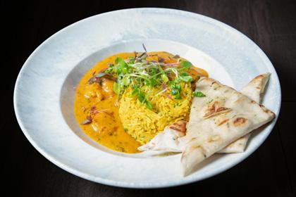Opposite: Thymesalted pork belly with cider & mustard sauce, roasted root vegetables, buttered greens & dauphinoise potatoes, £18.95. Above: Lincolnshire Poacher cheese soufflé with a port reduction & toasted walnuts, £7.95. Kerala & coconut king prawns in a spiced coconut curry, fragrant rice, garlic & herb flatbread, £18.95.