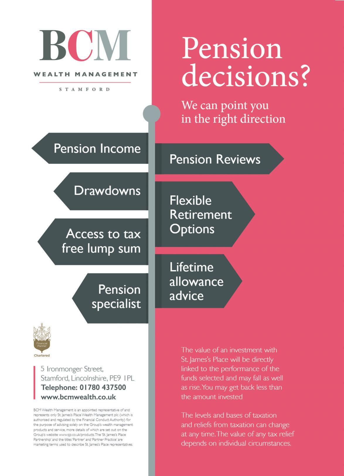 You can chat to our pensions specialist team at BCM Wealth Management, based at 5 Ironmonger Street, Stamford, Lincolnshire, PE9 1PL www.bcmwealth.co.uk 01780 437500