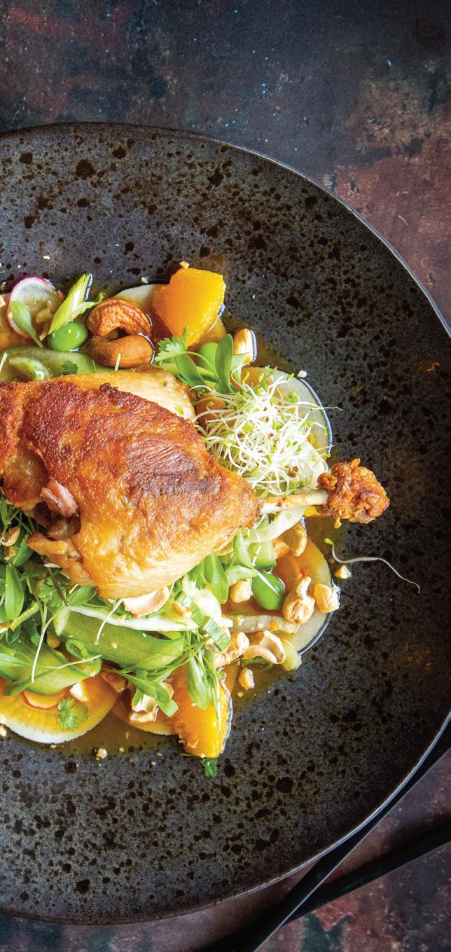 Confit duck leg with cucumber, pak choi, cashew nuts, and orange dressing.