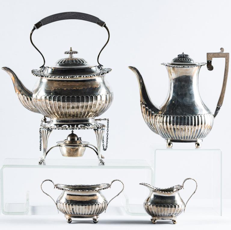 A partial set of BIRKS STERLING flatware, in the “New King” pattern, consisting of two serving spoons, eight dinner forks, seven dinner knives, eight dessert forks, sixteen luncheon knives, six teaspoons, twelve coffee spoons, four cream spoons, seven seafood forks, six butter spreaders, one butter knife, one small sugar tong, one large fish knife, one cake knife, one serving knife, twopiece carving set, and one pair of sterling grape shears (not Birks, marked sterling), 84 pieces total. Total weighable 2,043 grams.