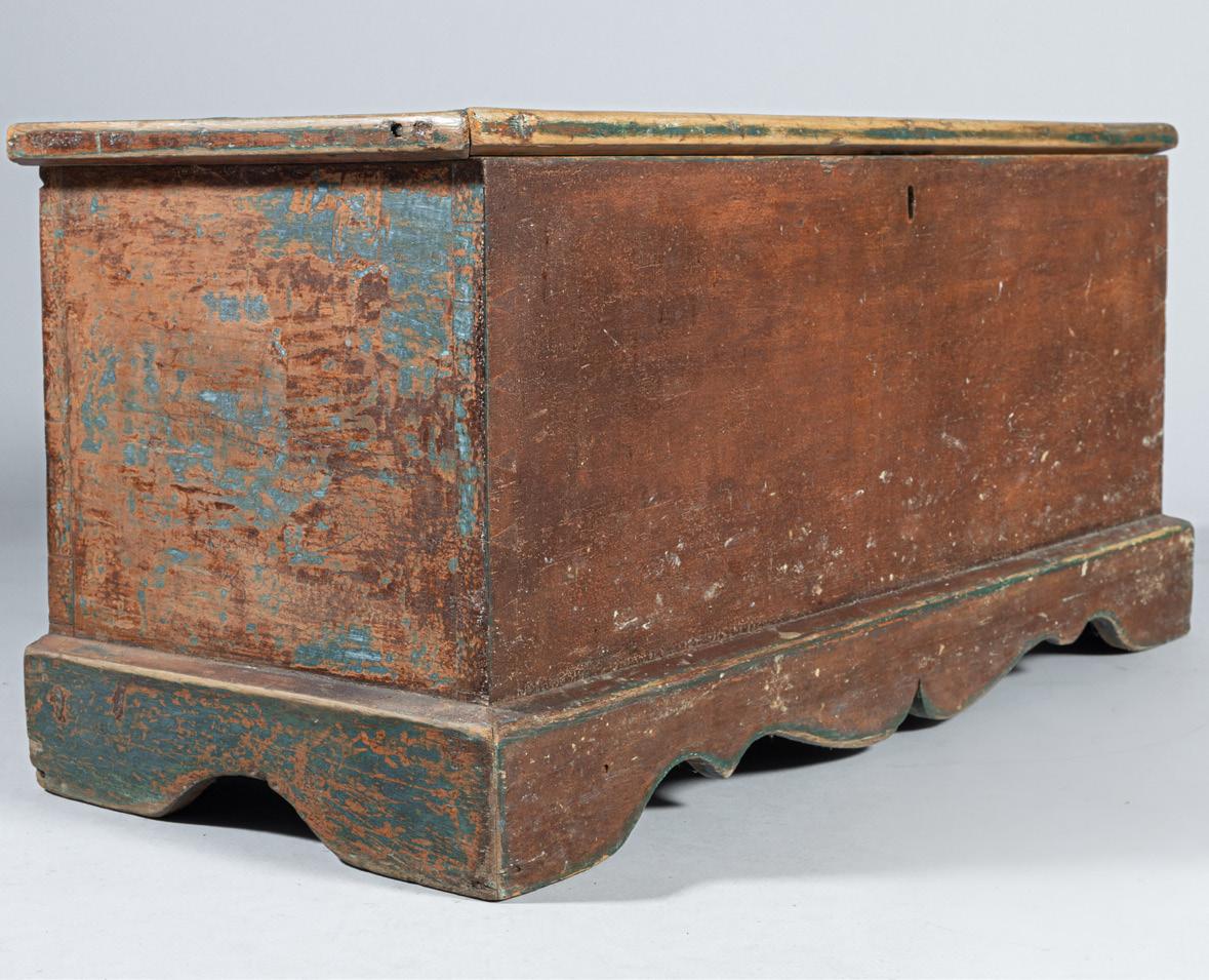 A Québec pine blanket box. Corner post construction with mouldings around the base and sides above the square feet. Old red paint on front, sides and back. Top is bare wood and likely from another box. 22” H, 37” W, 21” W.