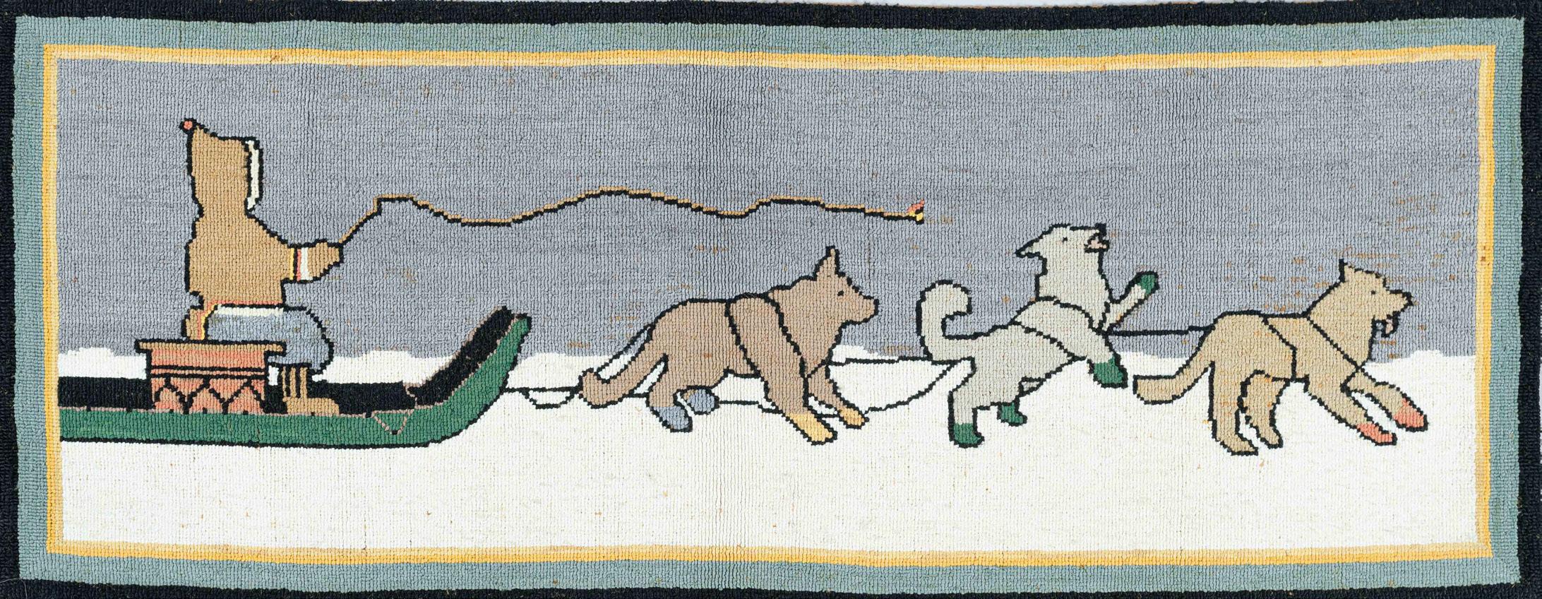 A hooked rug “Prince Edward Island, Silver Black Fox”, featuring a fox flanked by a woman and a man. Circa 1930. In generally good condition, hole in the man’s vest, some loss of material immediately below the fox and some wear along the lower border. 52” L, 22” W.