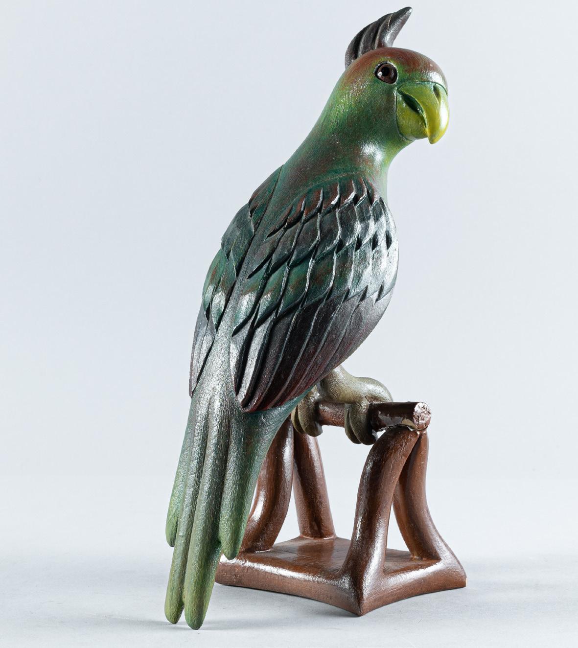 A very good wooden carving of a painted singing rooster, with brown painted feet and a painted, fan-shaped metallic tail, 16” H, 15 1/2” W, 6” D.