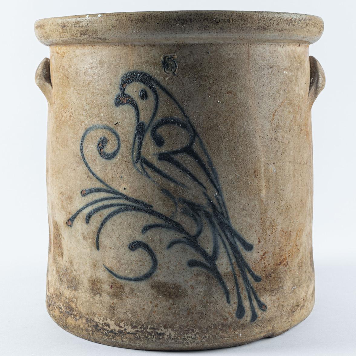 A five-gallon open salt glazed crock with a cobalt blue bird on a branch on the front. Handles intact. Significant cracks in three different places. Staining. Circa 1860. 13” H, 13” diameter.
