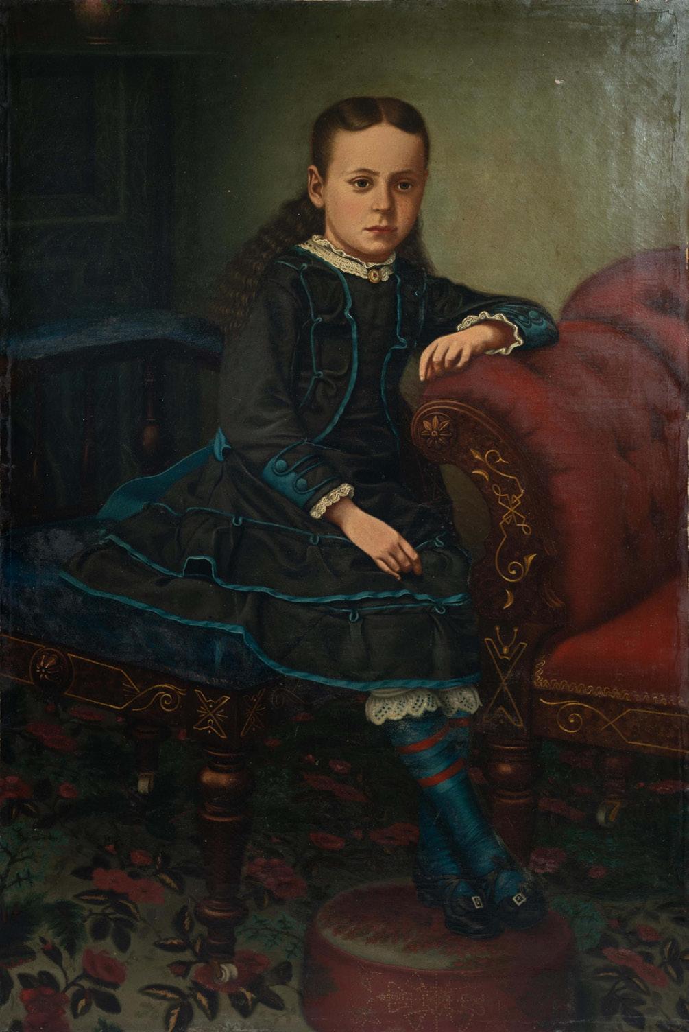 Two religious style portraits done in charcoal with white highlights. One of a boy holding a lamb. The other a young girl holding a musical instrument. Possibly original frames with shingle backs. Unsigned by the artist. In fair condition. Circa 1880. 19 1/2” H, 15 1/4” W.
