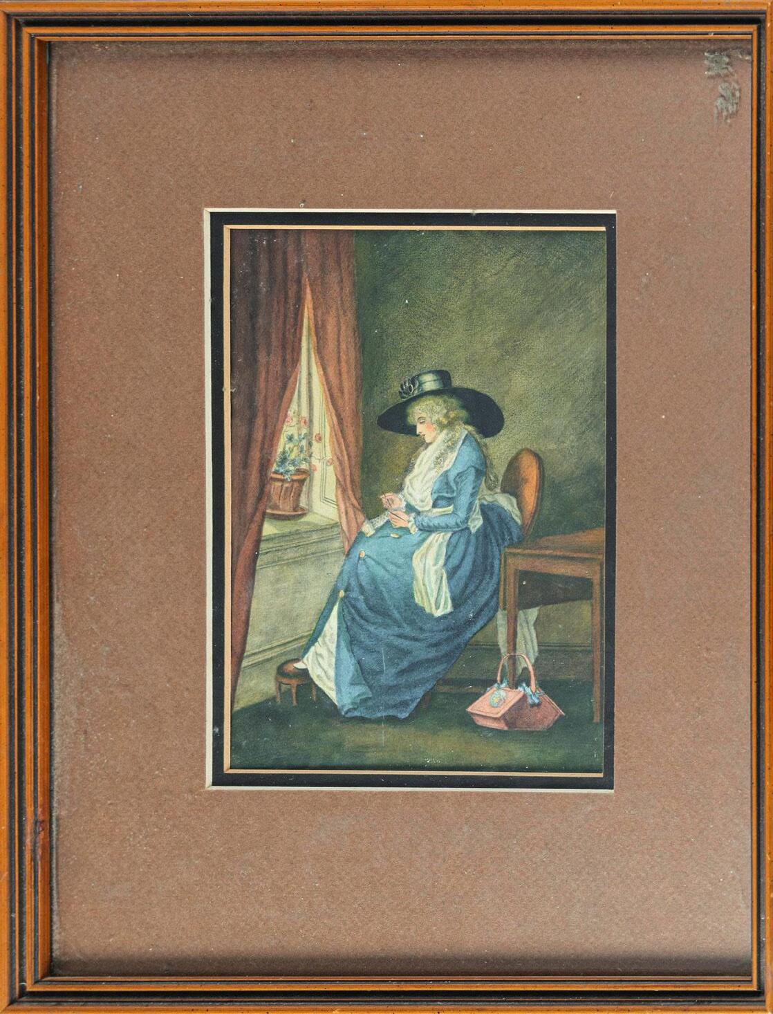 A framed watercolour of lady in an elaborate blue dress and large black had sewing by a curtained window with potted flowers. Tag on back identifies sitter as Jean-Charlotte 1760 - 1833. Contemporary frame and matting. 8 1/2” H, 6 3/4” W.