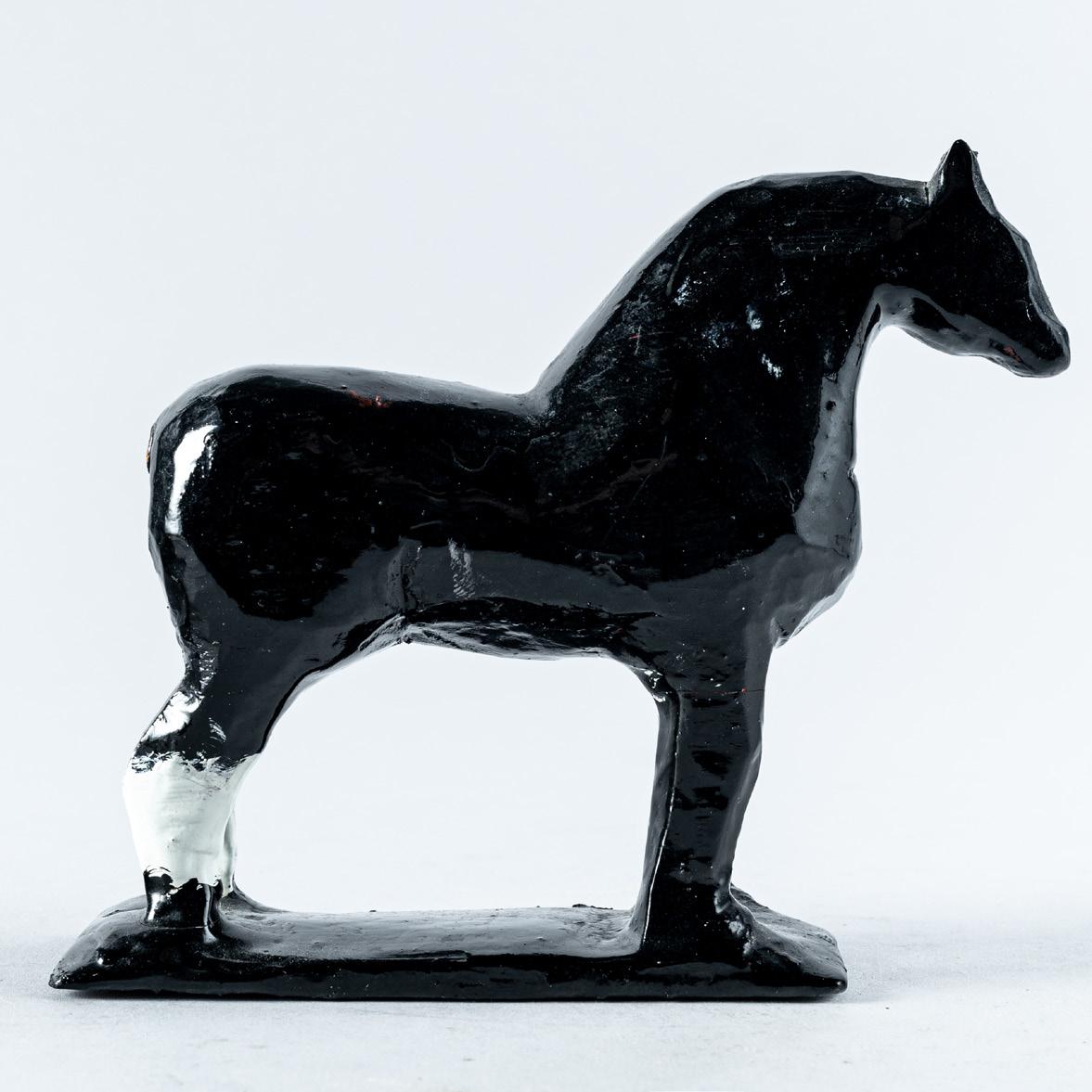 The horse carved from cedar with tufts of horse hair on the head, neck and tail. 12” H, 12” L.