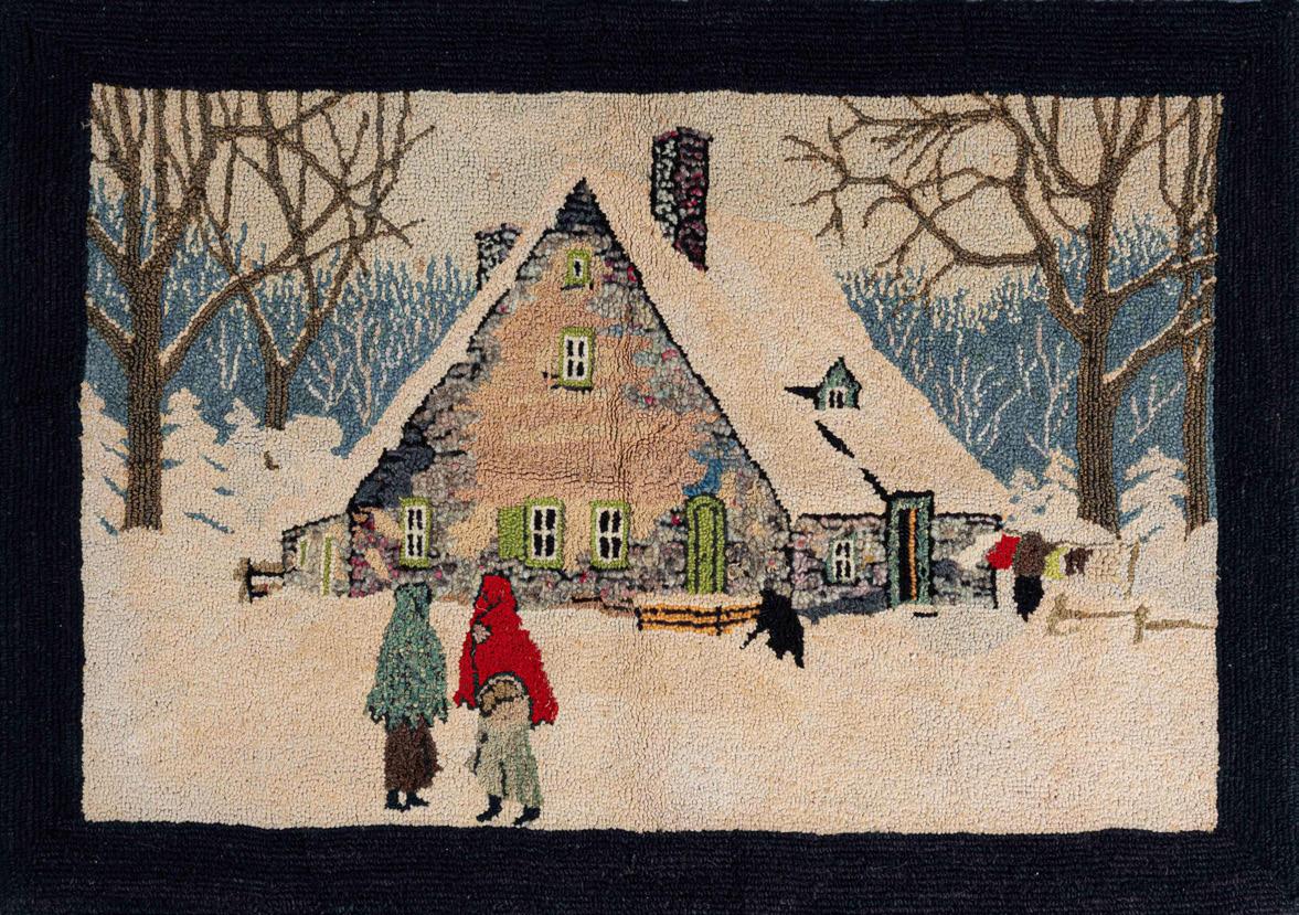 A hooked rug featuring a Québec winter landscape with a large multicoloured house, and two women in the foreground. Black border. Very good condition. 23 1/2” H, 34 1/2” W.