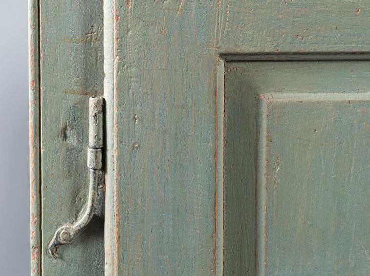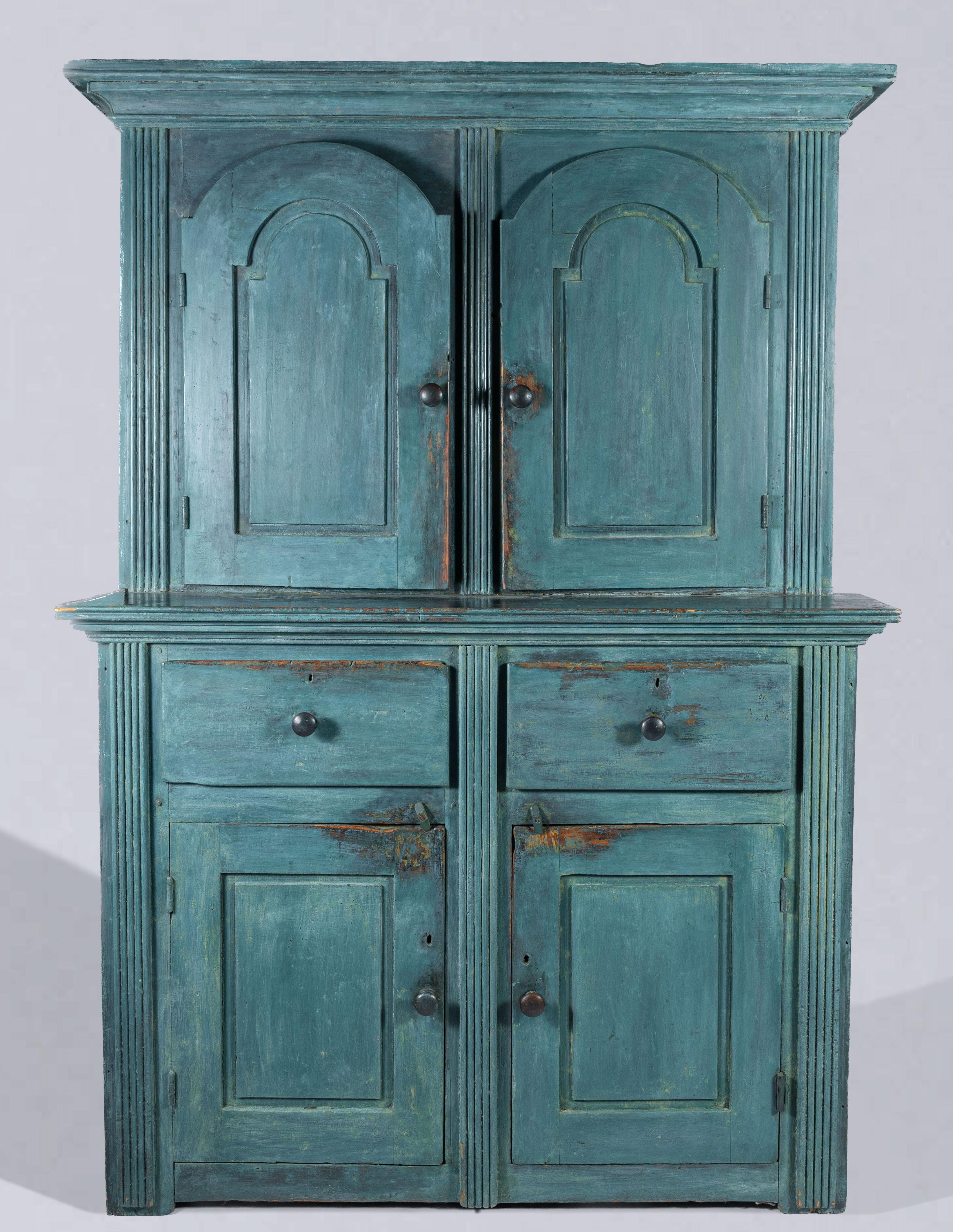 Circa 1820, originally from a private Canadiana collection in Kingston, Ontario. This fine one-piece cupboard has vertical pilasters on either side, surmounted by modest capitals and cornice. Original glazing in upper doors. Three deep dovetailed drawers at waist level. Two lower doors with bold raised fielded panels. This handsome architectural cupboard retains good two-tone paint throughout, dark blue green on case, complimented by light mid brown on the upper glazed doors, with appropriate wear. 85” H, 55” W, 19 3/4” D.
