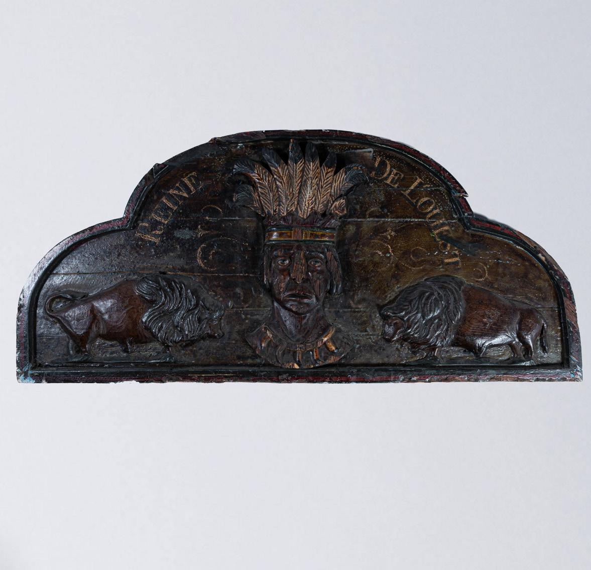 A large relief advertising wooden sign, “Reine de l’Ouest” (Queen of the West). 25” H, 53 1/2” W, 1 1/4” D (thick).