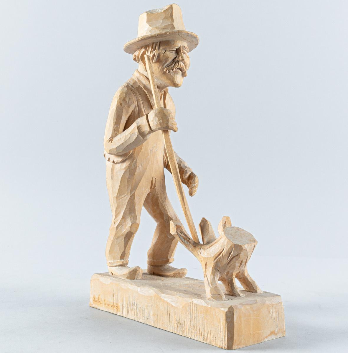 A painted folk carving of man’ with a brown leather hat and blue short - as part of a post on a wooden base. Height, 49”.