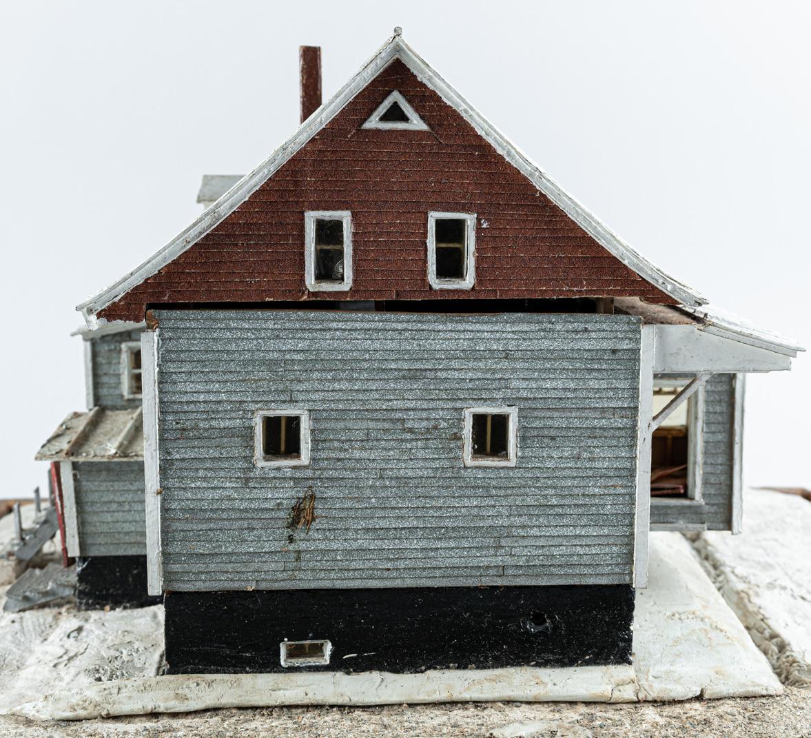 A model of an early Québec house with tin roof and curved eaves designed to shed snow and icicles away from the building. With removable roof and inner ceiling which allows for a view of each floor made from cigarette pugs. Mounted on a styrafoam base with added plaster substance to simulate snow on the ground. Circa 1960. Good overall condition. Portion of the barn wood moulding missing from two sides of the base. 8” W, 12” D, 9” H (house only).