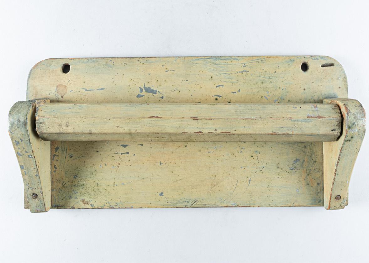 A good checker board in original paint, the base painted dark red with dark red and light blue painted squares. A section at each end in which to keep each player’s checkers. Round nailed construction. Excellent condition. Québec, circa 1930. 24 1/2” L, 13 1/4” W, 1” D.