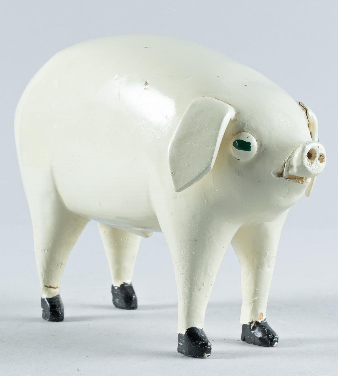 A wooden carving of a white cow by Ernest Villeneuve (b. 1926 - ) of Poine-au-Pic, Québec. Mounted on a red painted wooden base. Signed by the artist on the underside of the base. Circa 1990. 8” H, 12” L.
