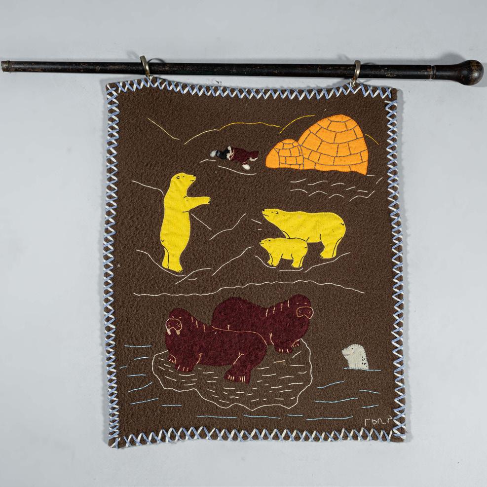 The brown wool background mat stitched with felt elements such as a figure entering an igloo, polar bears and seals, signed in syllabics lower right. 25 1/2” H, 21 1/4” W.