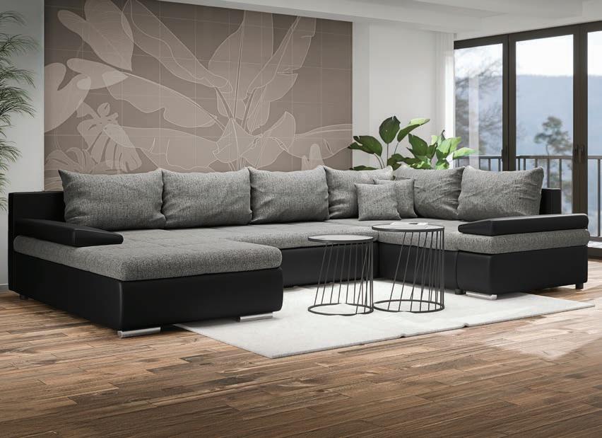 VELIKA GARNITURA U OBLIKU SLOVA „U“ idealna je za prostrane dnevne boravke. Na garnituri Milano, tapeciranoj u kombinaciji eko kože i tkanine s mnoštvom udobnih jastuka svatko će pronaći svoje mjesto.