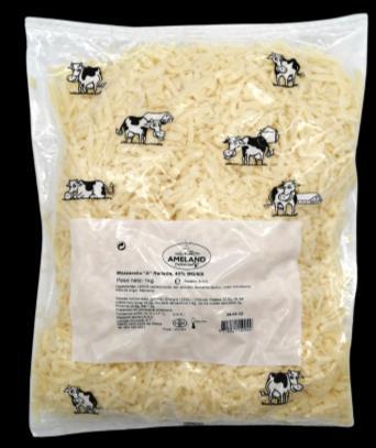 Queso mozzarella rallado, con un 50% de mozzarella pura y un 50% de análogo. Elaborado con sal y leche de vaca. Ideal parapastasy pizzas