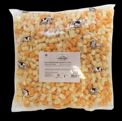 Mix de quesos gouda y cheddar en formato dados. Elaborado con sal y leche de vaca, con 50% de materia grasa. Ideal para ensaladas