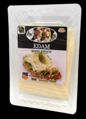 Queso edam con sal, en lonchas, de textura semidura y color amarillento Elaborado con leche de vaca, con 40% de materia grasa.Múltiples usos.Bandejaincluye50lonchasde 20gc/una.