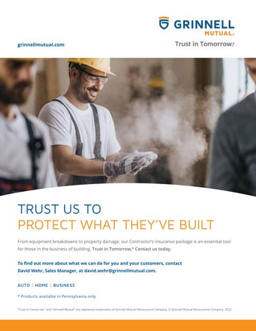 To find out more about what we can do for you and your customers, contact Davidequipment Wehr, Sales Manager,to atproperty david.wehr@grinnellmutual.com. From breakdowns damage, our Contractor’s insurance package is an essential tool for those in the business of building. Trust in Tomorrow.® Contact us today. AUTO | HOME | BUSINESS To find out more about what we can do for you and your customers, contact * Products available in Pennsylvania only