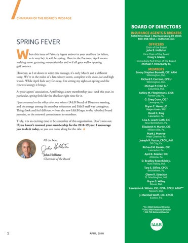 hen this issue of Primary Agent arrives in your mailbox (or inbox, as it may be), it will be spring. Here in the Poconos, April means melting snow, greening mountainsides and – if all goes well – opening golf courses.