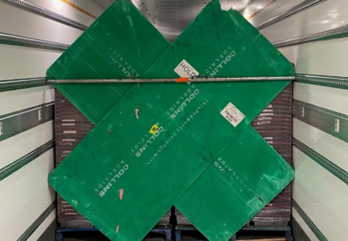 + Ensure pallets are positioned and secured appropriately to avoid load shift and damage. Load restraint boards should be criss-crossed to ensure airflow is not impacted.