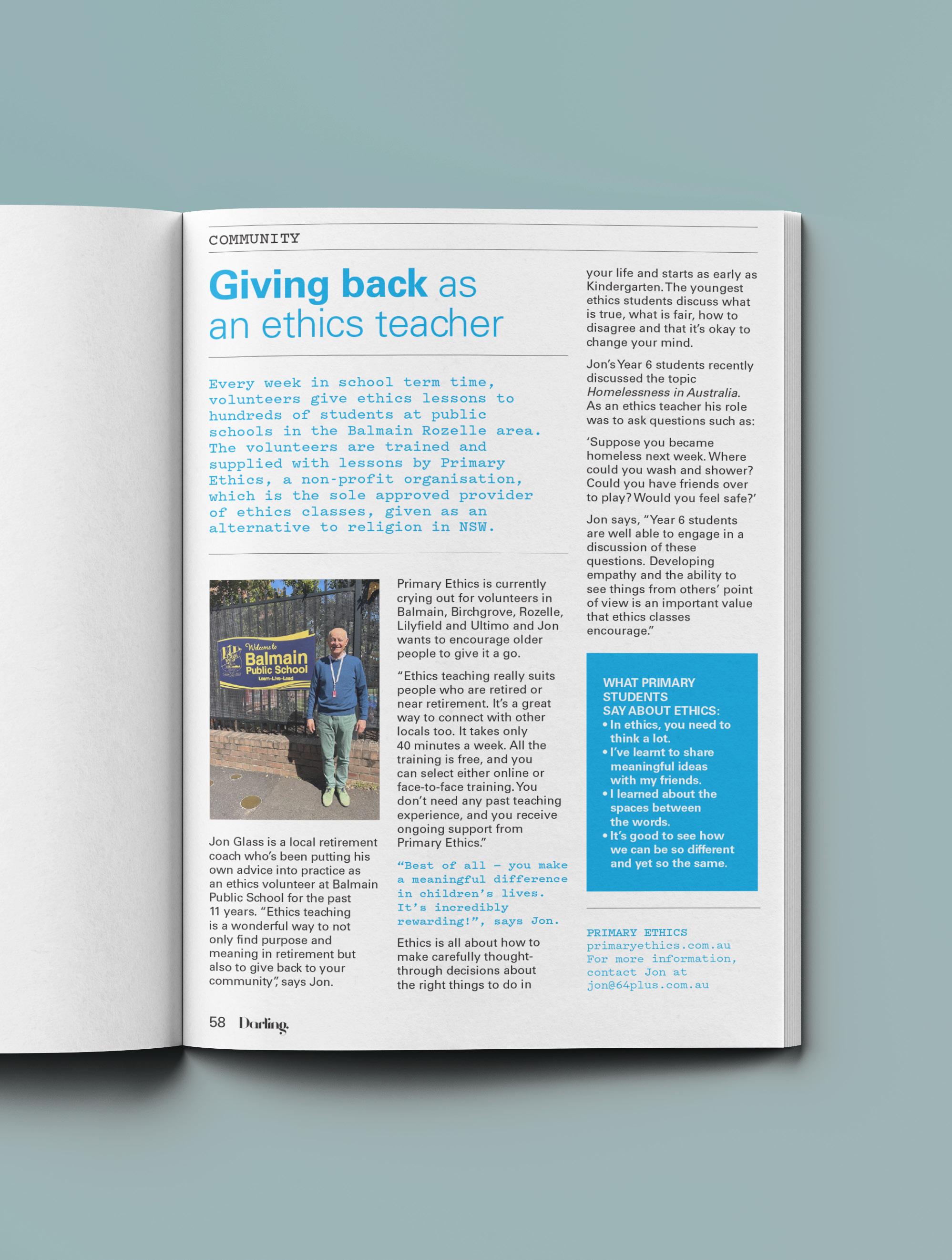 I started teaching ethics when my daughter began Kindergarten at our local public school at Hornsby. At the time there weren’t enough volunteers, so I decided to train as an ethics teacher. Since then, I’ve had the joy of teaching Kindergarten, Year 1, and Year 2 and yes, even the special experience of teaching both my children along the way.