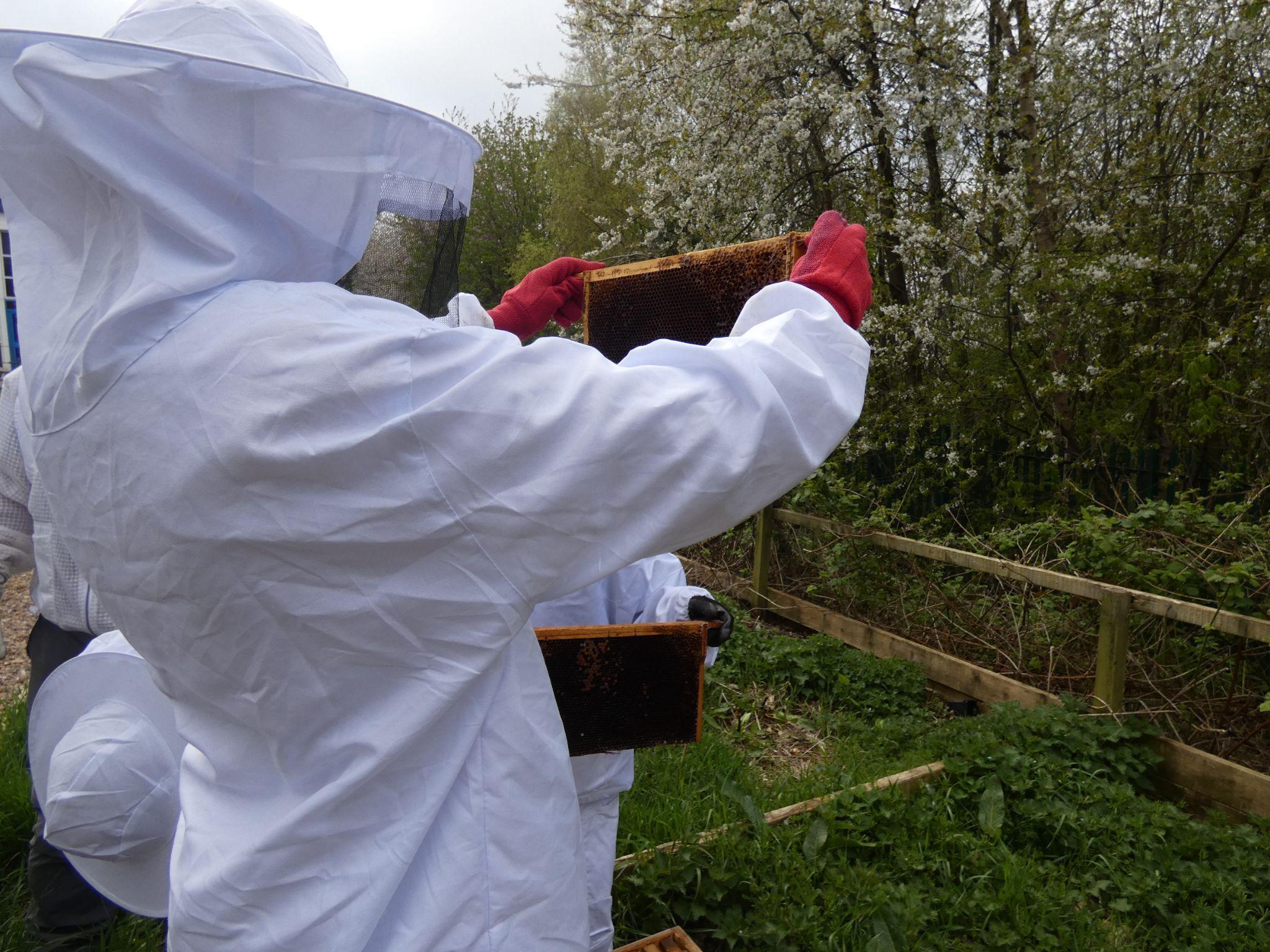 Another group of learners have been doing the first hive inspections of the year and were checking the brood for disease etc. The hives were all fit and well and some honey trays have been placed ready for the bees to start producing. We used smoke to calm the bees down before the inspection.