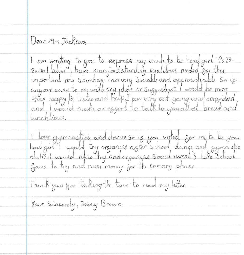 Each year, the Primary Phase votes for their Head Girl and Head Boy as well as School Prefects. The application letters this year were amazing and it will be really difficult for the children to choose!
