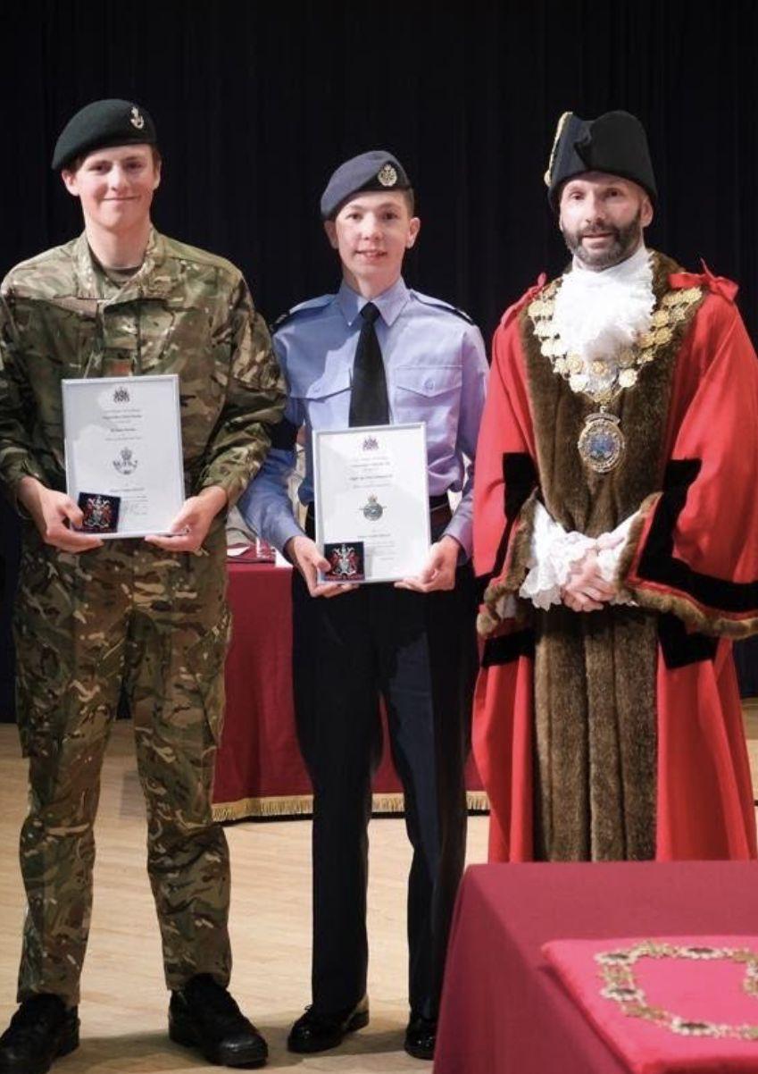 Both an Army Cadet Sgt Isaac Hartley and RAF Cadet Sgt Elliot Hawsford; seen here collecting their Mayor’s badge and certificate.