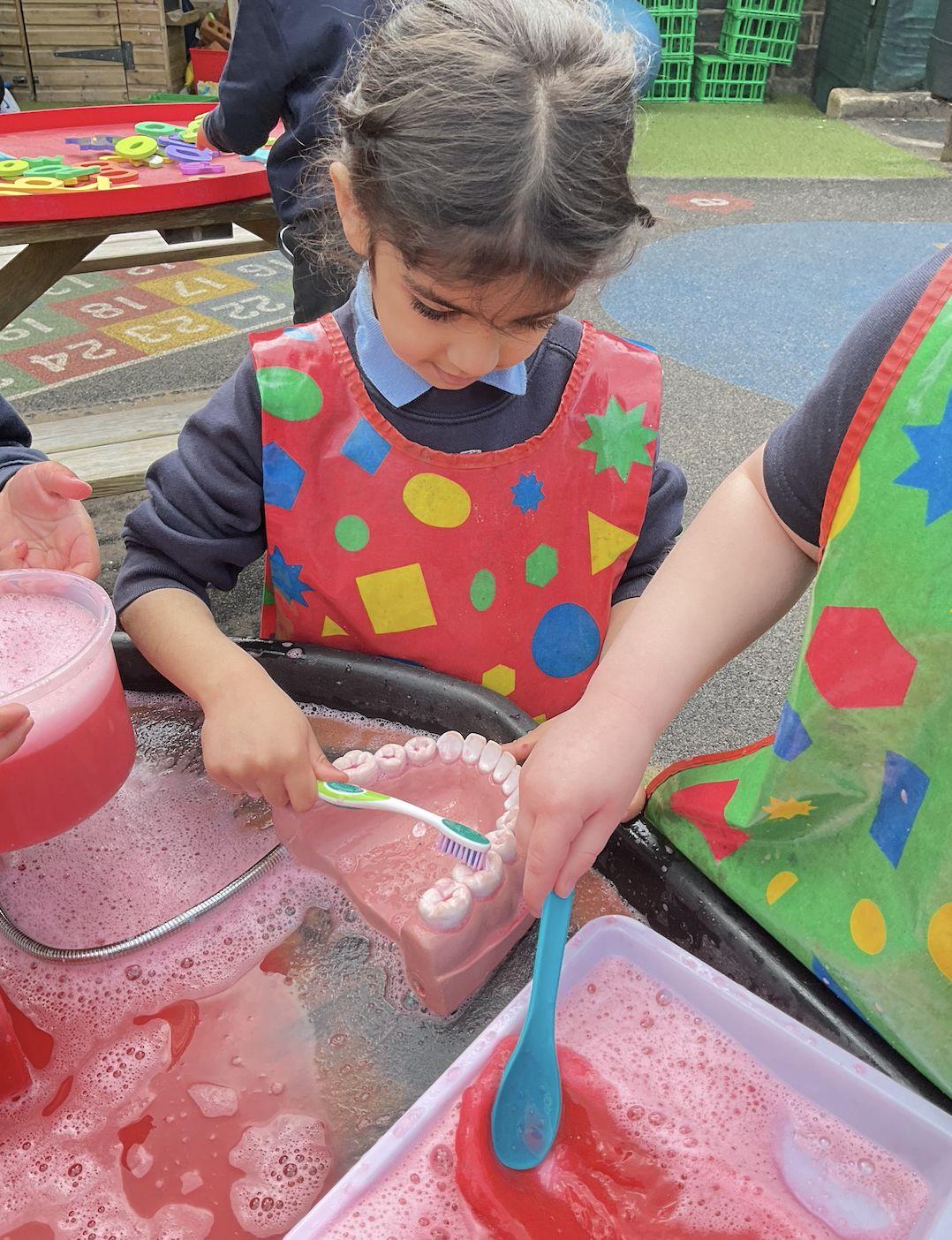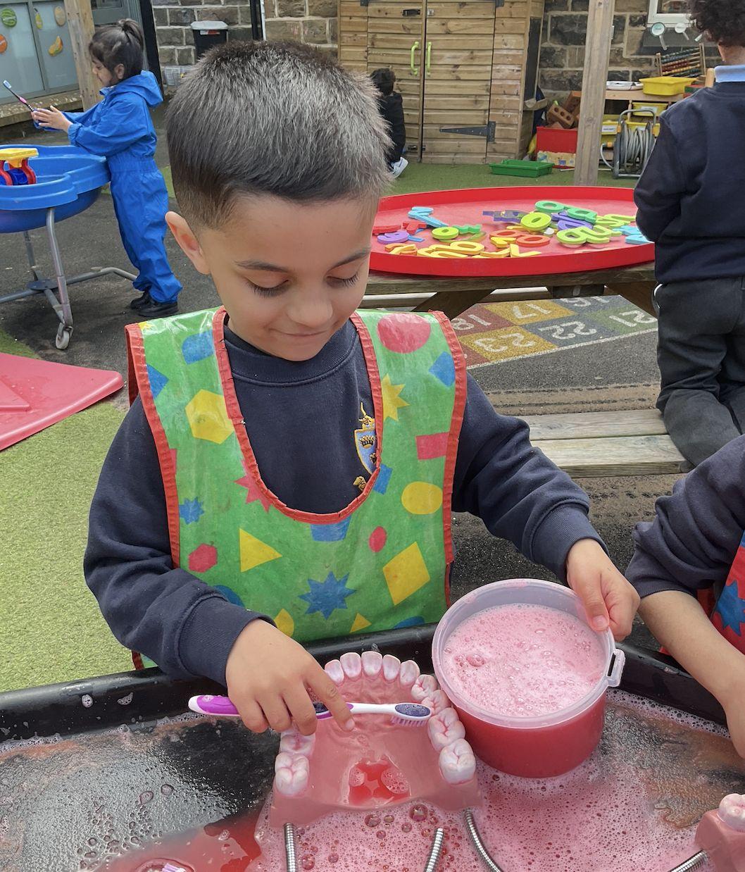 During their outdoor play; Reception class have used paint, soap and water to brush a large set of teeth and practise the ‘side-to-side’ and ‘up and down’ motion whilst recognising the importance of regular teeth cleaning. They scrubbed and washed away the paint stained on the teeth until they were sparkling clean. There were plenty of gleaming smiles as the learners brushed up their knowledge of oral hygiene!