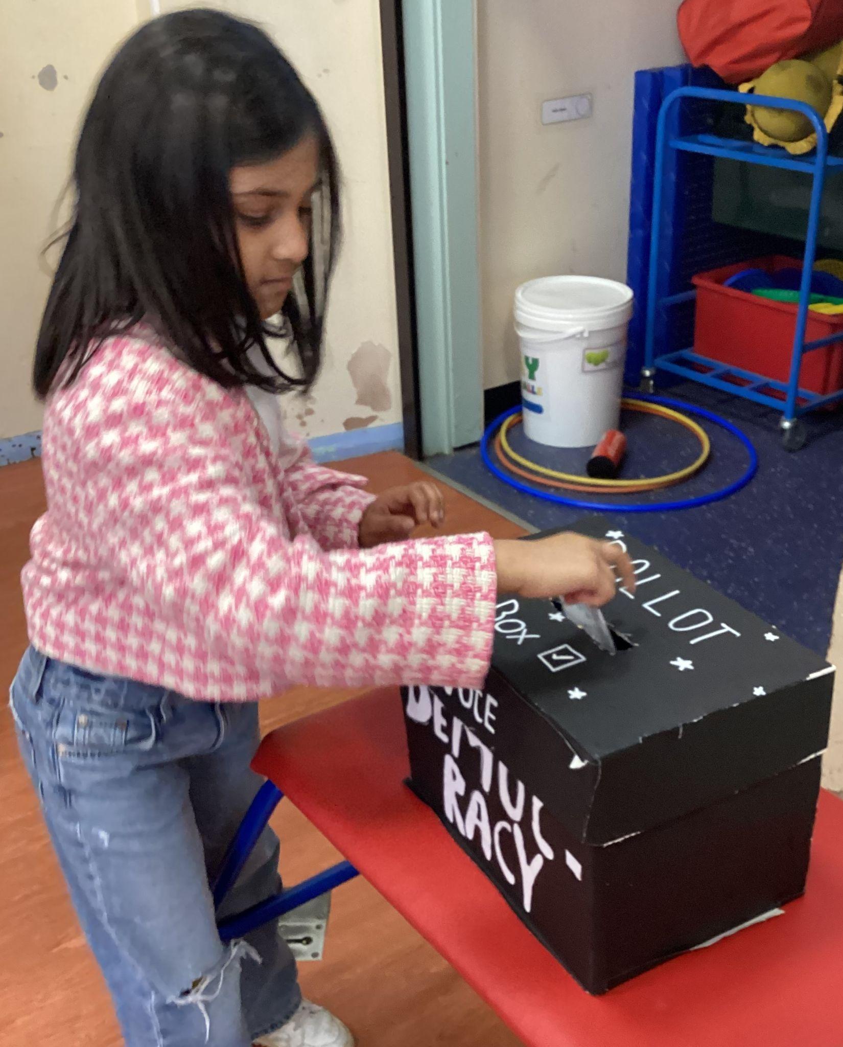 A group of Year 6 learners took the role of clerks and informed everyone of the correct terminology: polling station, polling booth, ballot box and ballot paper, before the proceedings began.