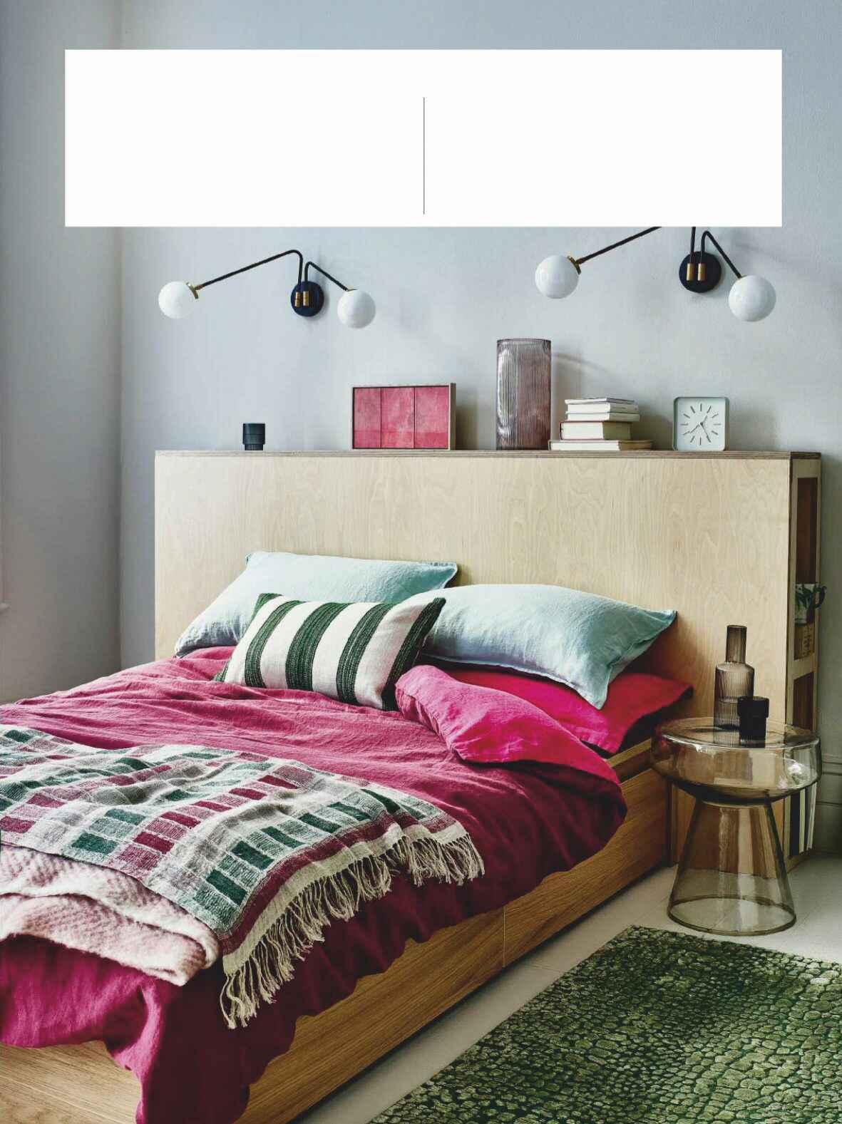 Un dormitorio en verde, rosa y madera