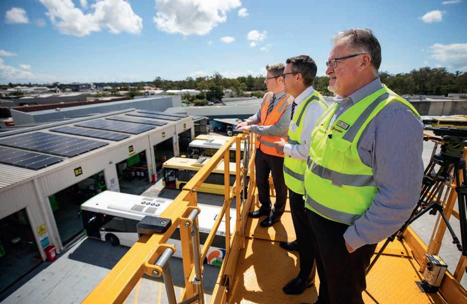 Above: L-R: Transdev Australasia head of engineering Marc Cleave, TransLink CEO Matt Longland and Transdev Queensland head of business operations Mark McKenzie looking at solar panel installation at Transdev’s Capalaba Depot, Brisbane. Image credit: Nicholas O’Sullivan.
