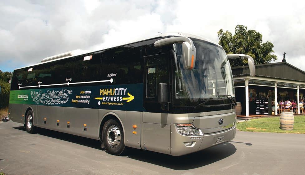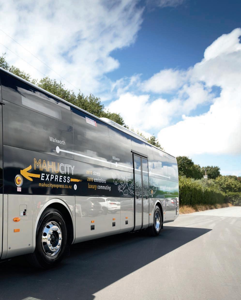 Passengers can book a seat online or through an app, with a free trial included; Mahu City Express showcased its first Yutong Tce12 coach at a special event at the Matakana Sculptureum.
