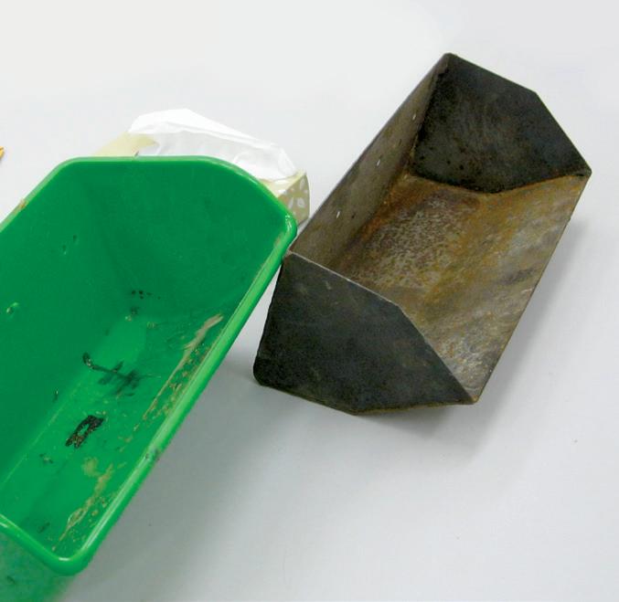 Old style fabricated steel bucket and CC type bucket. Discharge chute aft er modifi cations.