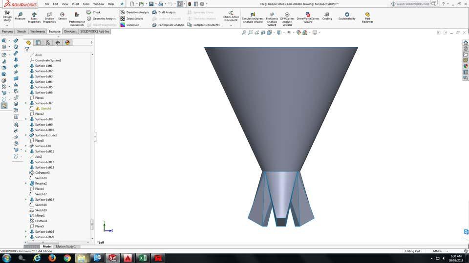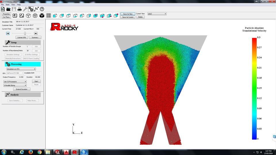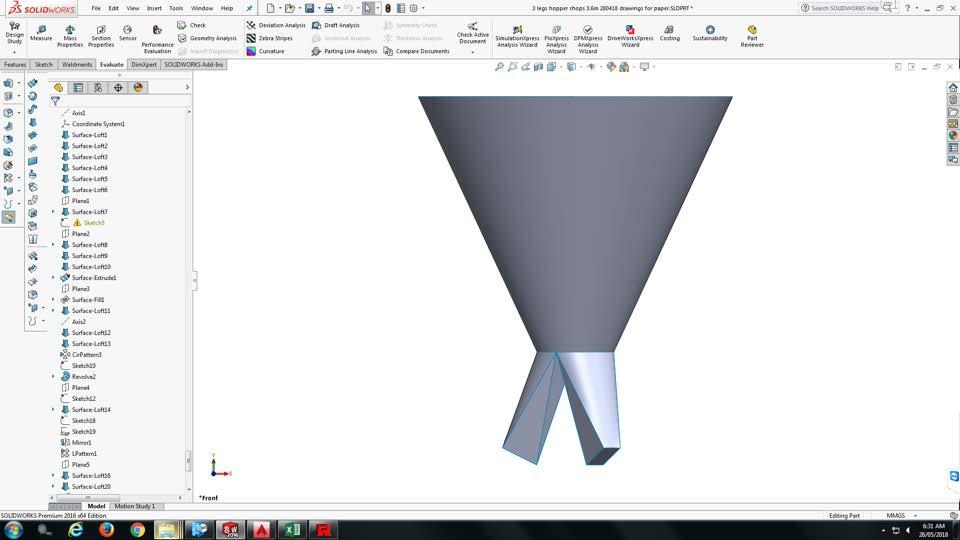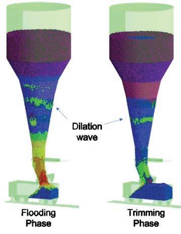 Figure 2 shows the DEM simulation of symmetric filling and emptying processes. All the three leg chutes were operating to allow the material to be discharged immediately once the particles had settled. The DEM results in Figure 2 (b) and (c) show the intermediate flow pattern during discharge due to the