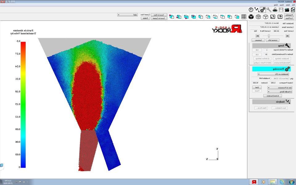 Figure 4: Snapshot of material eccentric discharge (DEM) - one leg chute discharging.