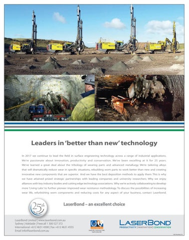 Leaders in ‘better than new’ technology In 2017 we continue to lead the field in surface engineering technology across a range of industrial applications. We’re passionate about innovation, productivity and conservation. We’ve been excelling at it for 25 years. We’ve learned a great deal about the tribology of wearing parts and advanced metallurgy. We’re tailoring alloys that will dramatically reduce wear in specific situations, rebuilding worn parts to work better than new and creating innovative new components that are superior. And we have the best deposition methods to apply them. This is why we have attained prized strategic partnerships with leading companies and university researchers. Why we enjoy alliances with key industry bodies and cutting edge technology associations. Why we’re actively collaborating to develop more ‘Living Labs’ to further pioneer improved wear resistance methodology. To discuss the possibilities of increasing wear life, refurbishing worn components and reducing costs for any aspect of your business, contact Laserbond.