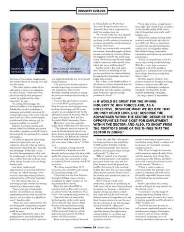 and sophisticated way as a sector could really benefit us.” The good stories Sanders refers to include major leaps in electrification and automation, plus the fact Australia’s mining industry is among the most environmentally friendly in the world. Tony Le Bas also had an extensive career with BHP spanning more than 30 years as a metallurgist-comemarketer for coking coal. He wrote a report on metallurgical coal for the Minerals Council of Australia (MCA) as part of its series, Best in Class: Australia’s Bulk Commodity Giants. He believes coal has copped an unfair share of criticism over his career. “The industry needs to respond to some of the falsehoods that are out there. Coal is definitely demonised at the moment, and I think the industry needs to hit back from time to time and state some of these facts,” Le Bas says. “For example, coking coal will be needed for at least the next few decades and we produce the best in the world. By using our coking coal, blast furnace coke rates around the world are reduced, hence reducing their CO2 emissions. “For those worried about CO2 emissions, they should be advocating for Australian coking coal.” This is like iron ore from Western Australia’s Pilbara region, which is recognised by export markets as the top product they can buy. Brent has more than BHP in common with Le Bas, as he was also an author for the MCA’s Best in Class series – his report focusing on iron ore. Australia’s iron ore lump is the highest quality in the world, going almost directly from mine to blast furnace with minimal processing. In 2019, Australia exported 174 million tonnes of lump ore, which helped to avoid around 30 million tonnes of CO2 emissions. Brent says unprecedented demand