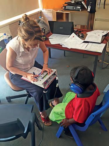 Cover – Earbus cofounder, nurse audiometrist Dee Parker, checking a client’s ears. Image: Earbus.