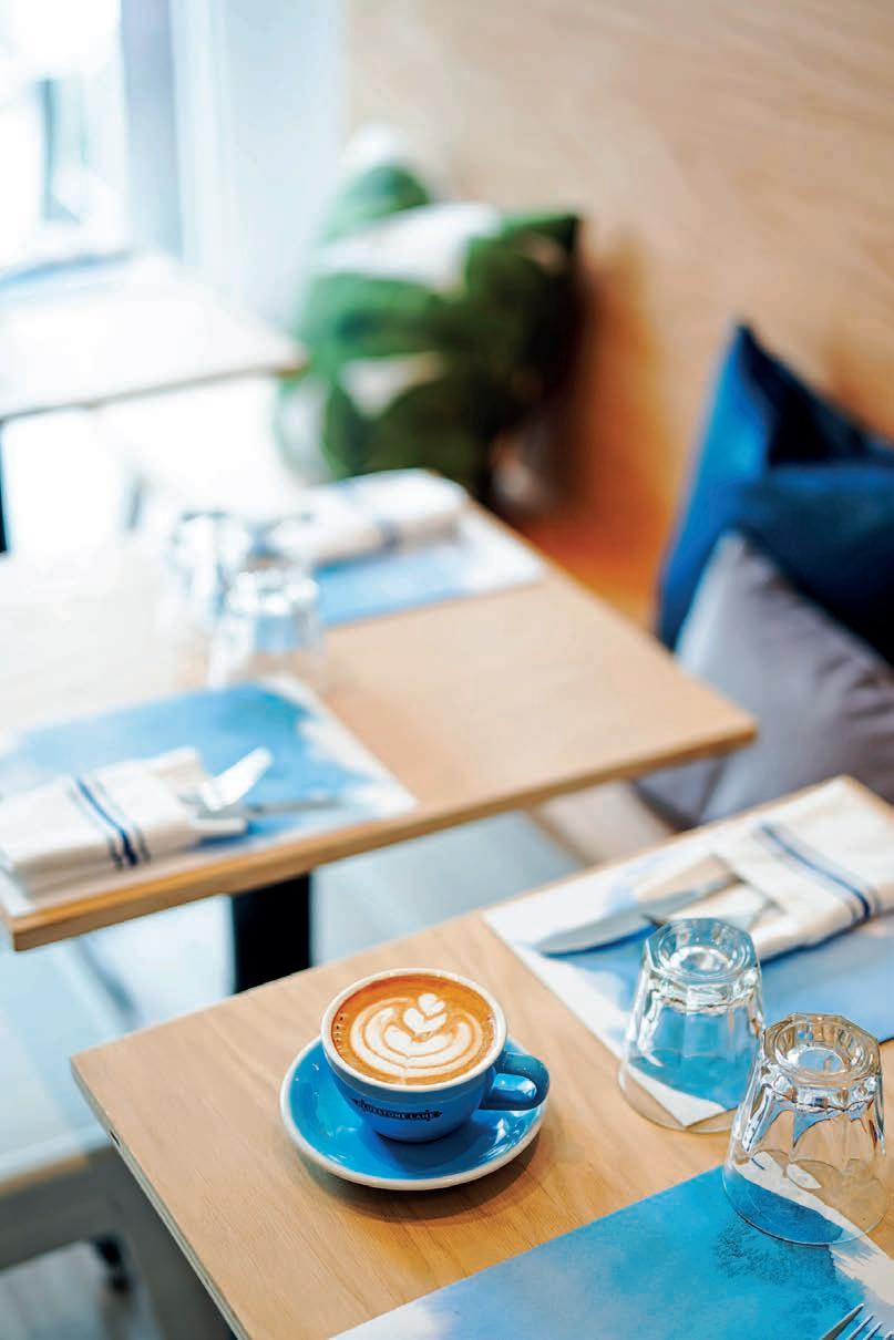 philosophy, a culture which sees regular customers become friends with other regulars, and staff encouraged to build ongoing relationships with customers. This community-building approach, coupled with blue neon-light signage and bright and summery colours of teal, white, and a hint of pastel pink, means that guests come in feeling uplifted.